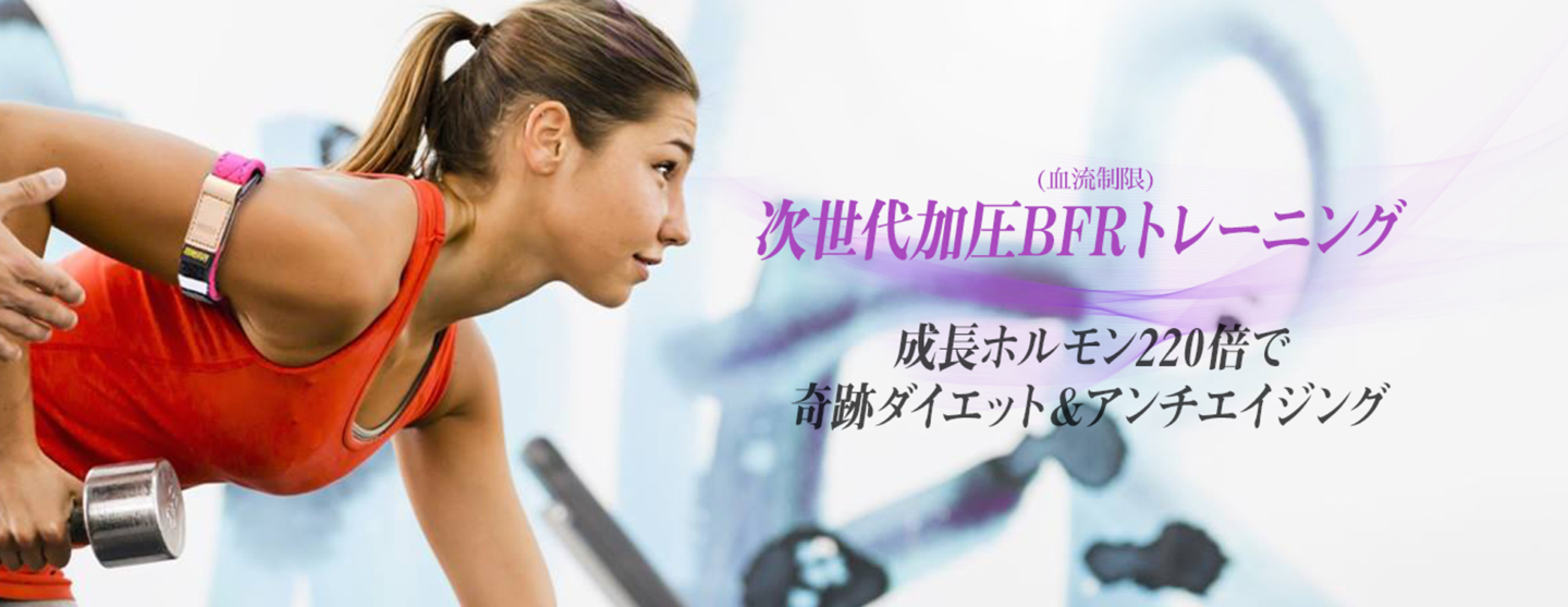 BFRとはBlood Flow Restriction(=血流制限)の略称です。腕や脚の付け根に専用のベルトを巻き、血流を制限して行うトレーニングです。血流を制限する事により成長ホルモンが安静時の約220倍も分泌され、脂肪燃焼、筋肉量増加、アンチエイジング、疲労回復などの効果があります。