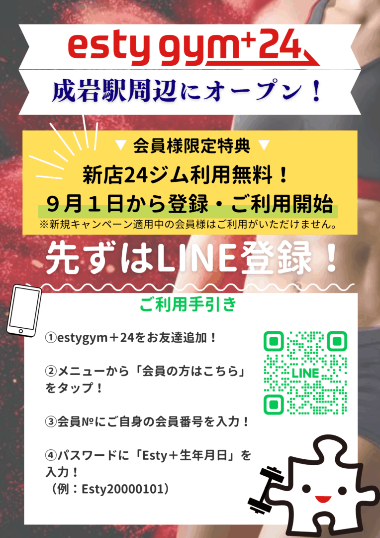 限定で9月以降に「esty gym+24」のLINE登録と入会手続きを行っていただき、